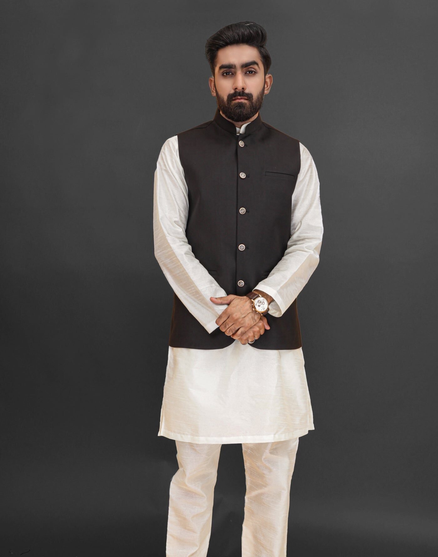 Black plain waistcoat for men. Premium quality fabric, suitable for formal and semi-formal occasions.
