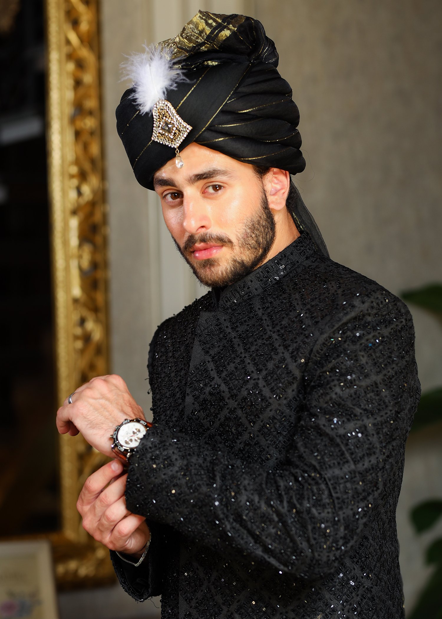 Elevate your wedding look with the striking Sherwani Black D01 by Azlan Shahzad, exclusively available on azlanshahzad.com. Crafted from premium raw silk, this black sherwani features a refined regular fit with intricate embellishments, including detailed sequence work, cut dana, and cora craftsmanship across the front. Designed specifically for groom wear, it delivers a bold yet elegant aesthetic, making it the perfect statement piece for your big day.