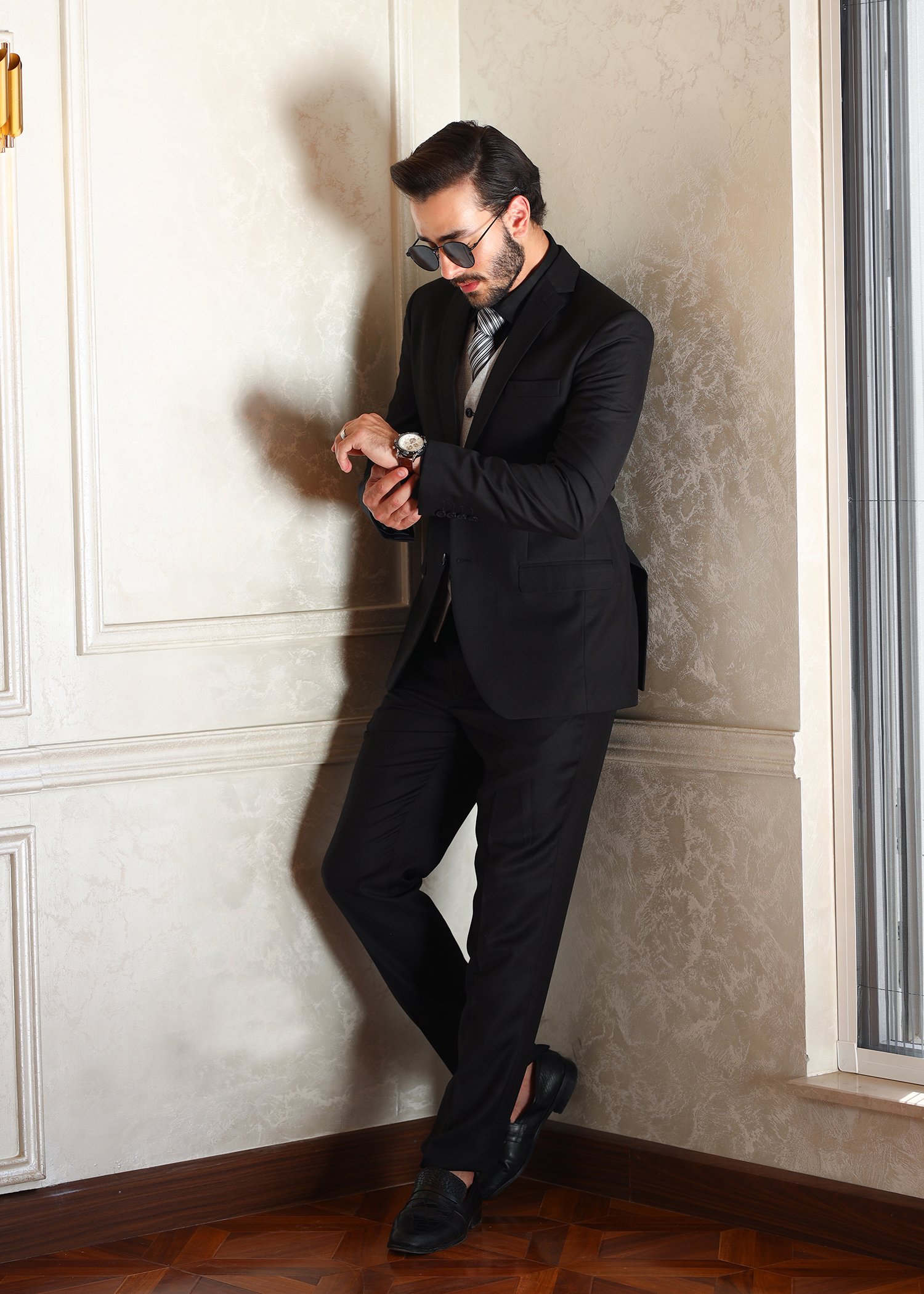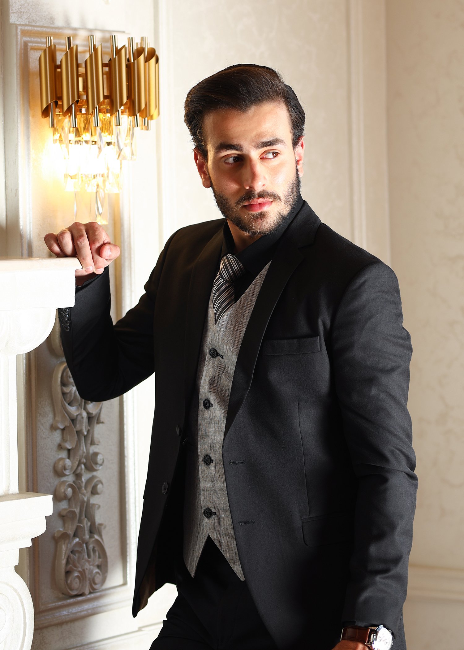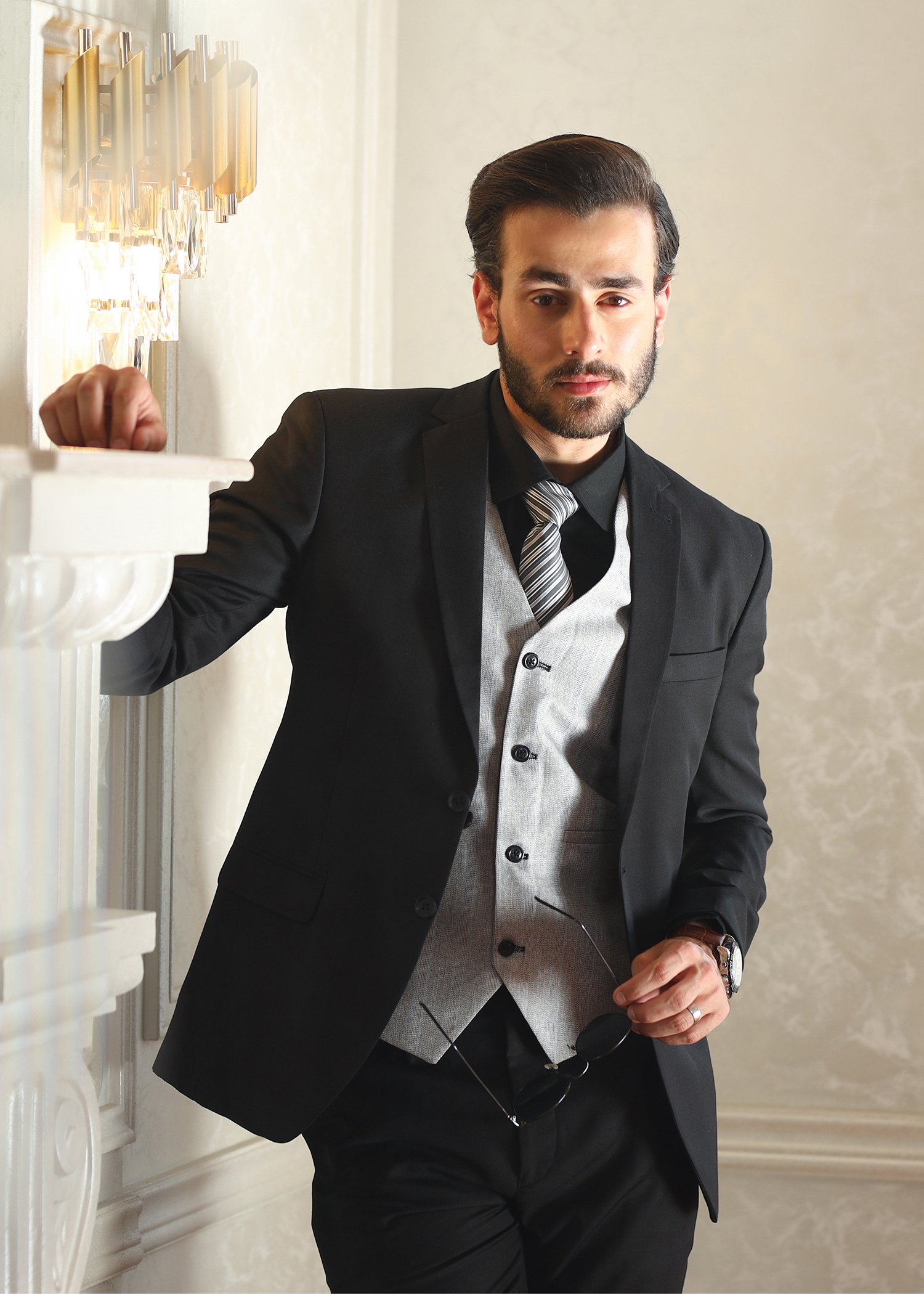 A classic black tuxedo paired with a contrasting grey waistcoat for a refined and modern look. Designed with a sharp fit and clean detailing, this ensemble adds depth and elegance to formal wear.