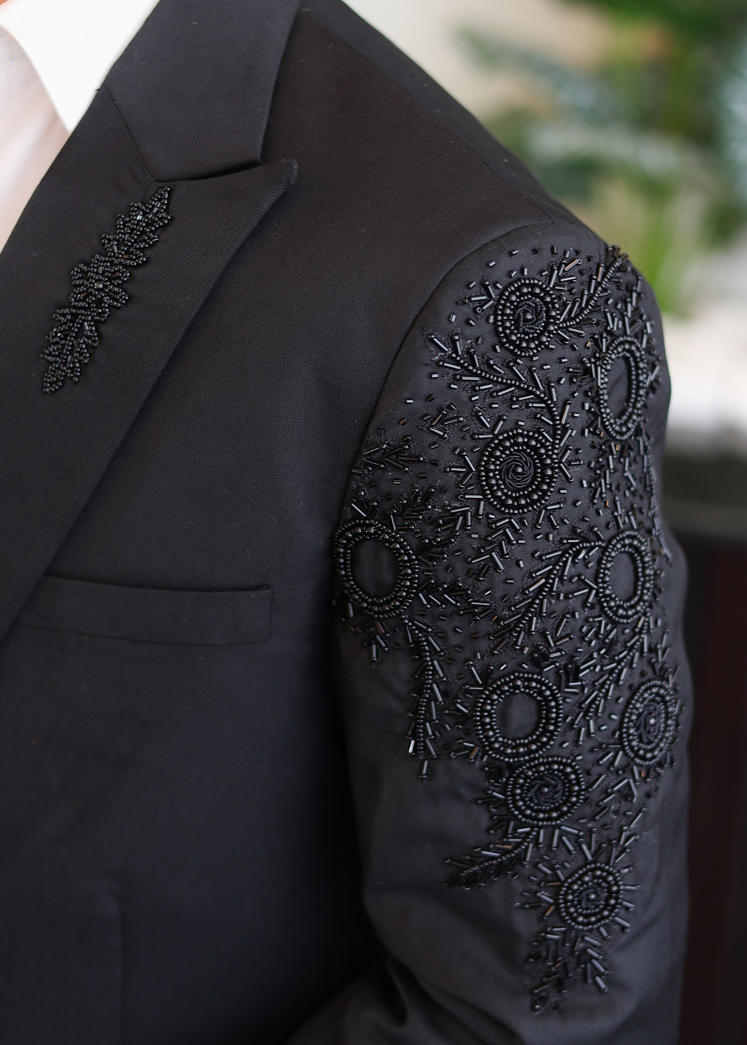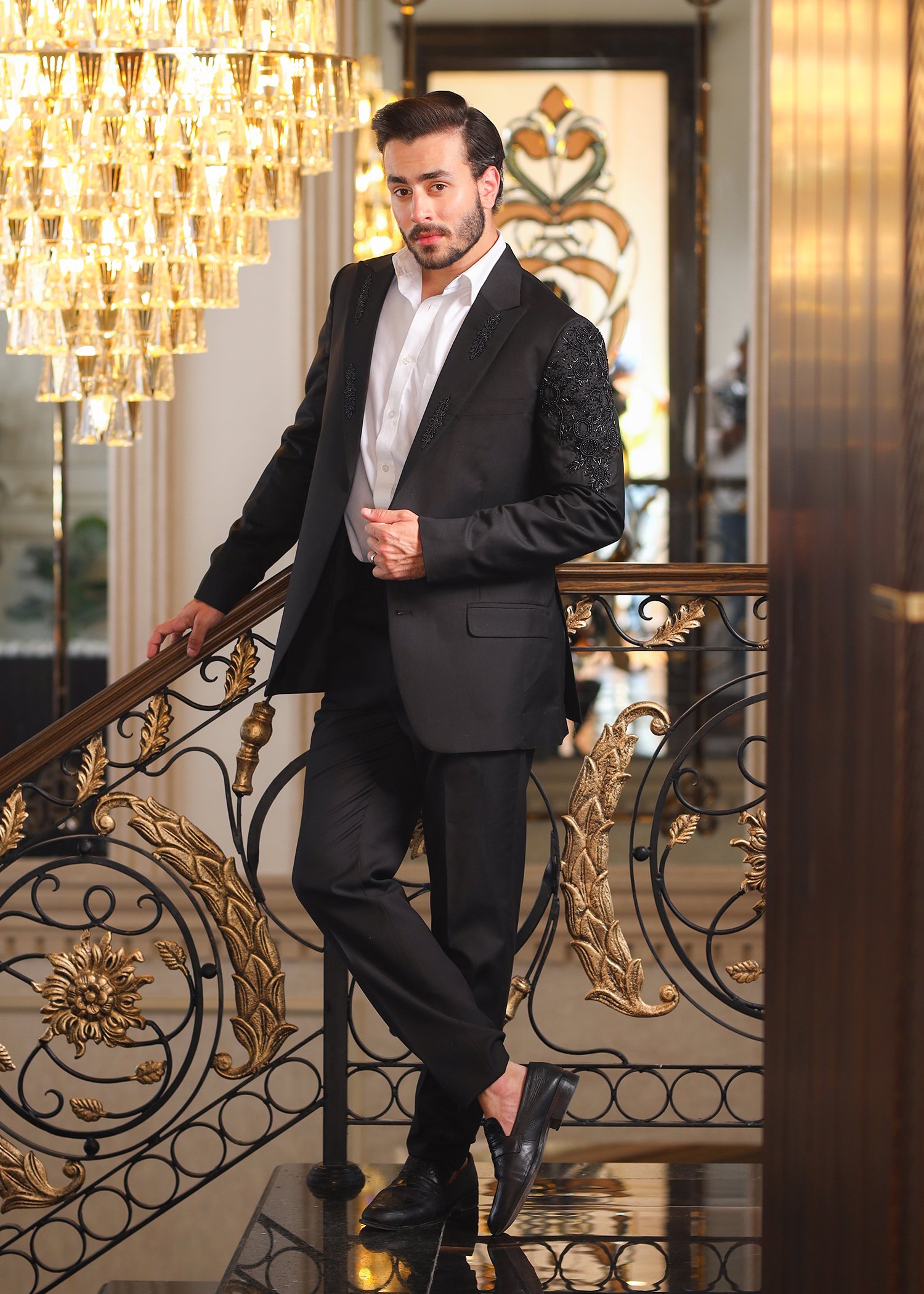 A timeless black tuxedo designed for formal elegance. Featuring a sharp silhouette and refined detailing, this piece is perfect for weddings, receptions, and evening events.