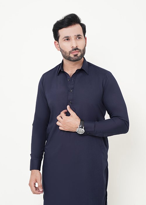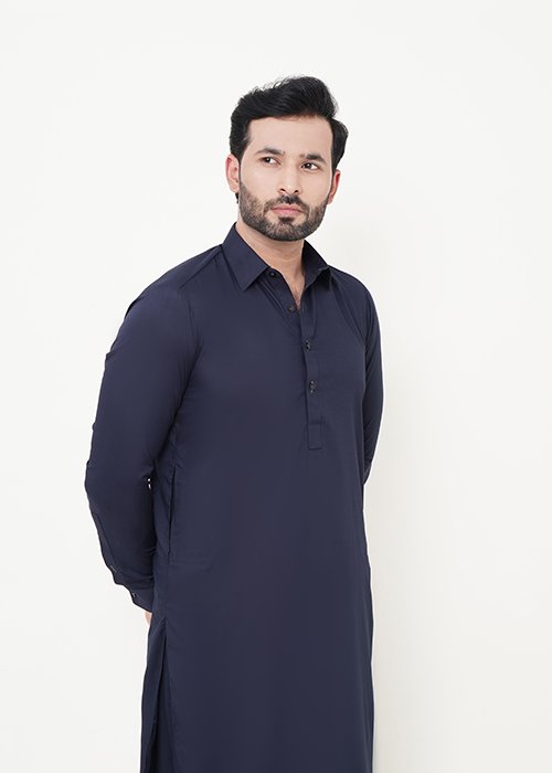 Upgrade your wardrobe with this premium navy blue suit-collar shalwar kameez by Azlan Shahzad, available on azlanshahzad.com. Designed with a modern slim-fit silhouette, this 2-piece outfit is crafted from high-quality wash & wear fabric, making it lightweight, breathable, and perfect for all-day comfort in every season. The elegant suit-style collar adds a sophisticated touch, making it ideal for both casual wear and semi-formal occasions.