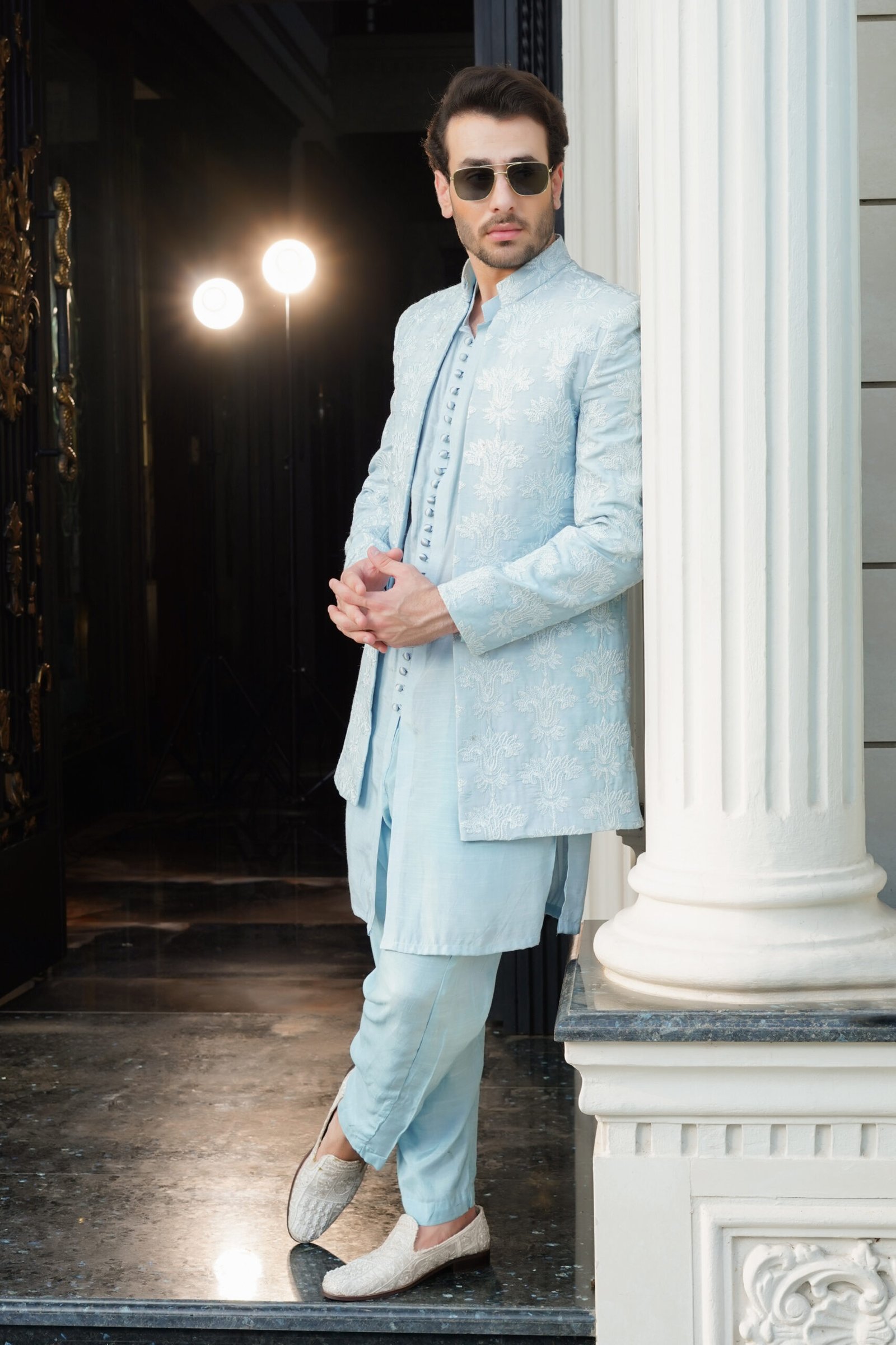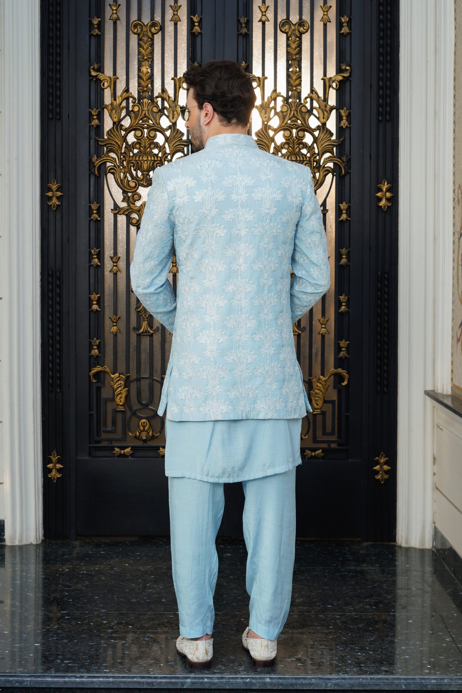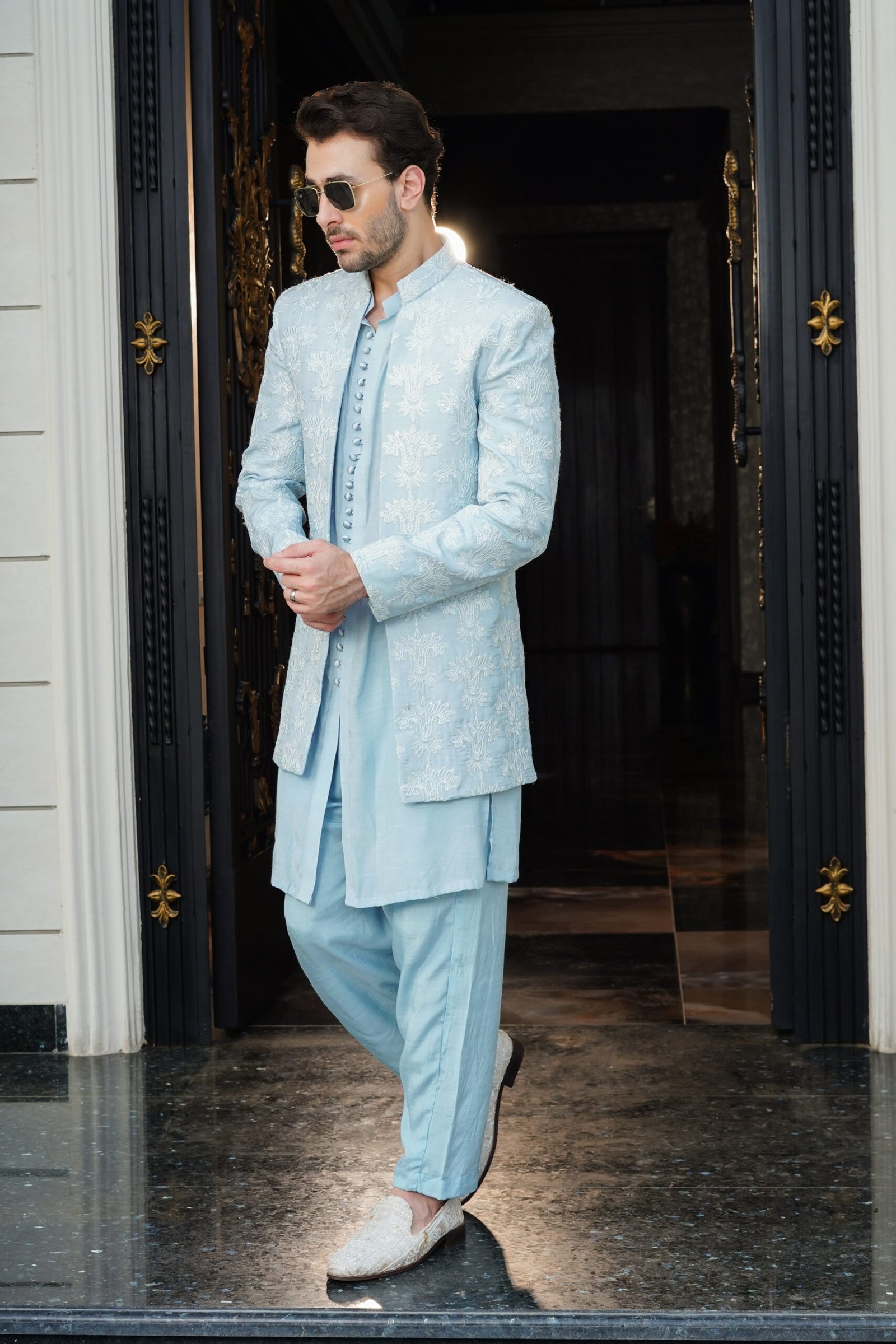 Shop our exclusive collection of hand-embroidered men’s ethnic wear, designed for a bespoke fit and effortless elegance. Each piece is engineered with precision tailoring to provide comfort without compromising on its sharp, structured silhouette. Order your Powder Blue Prince Coat today and experience the luxury of high-definition embroidery and premium fabrications delivered to your door.