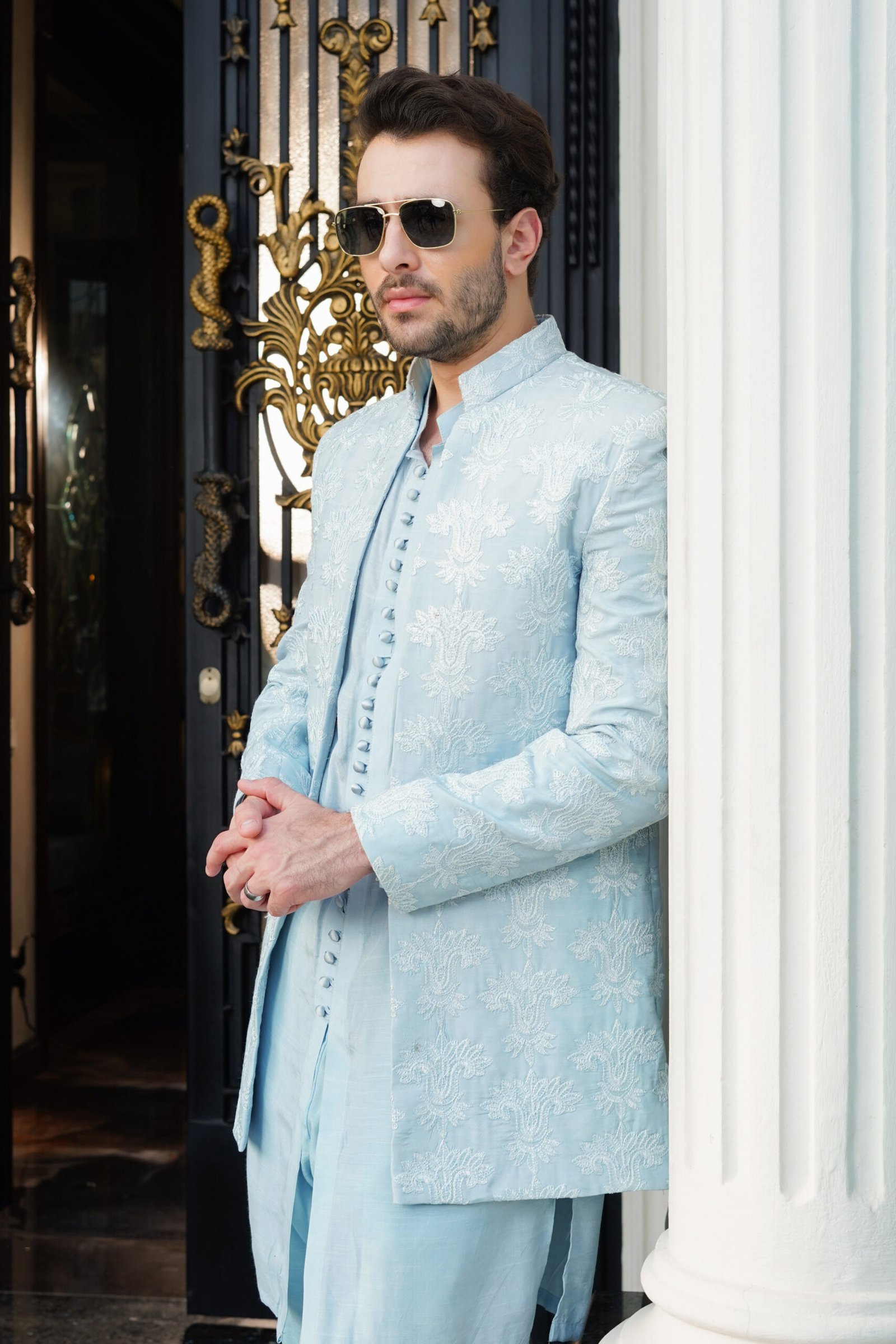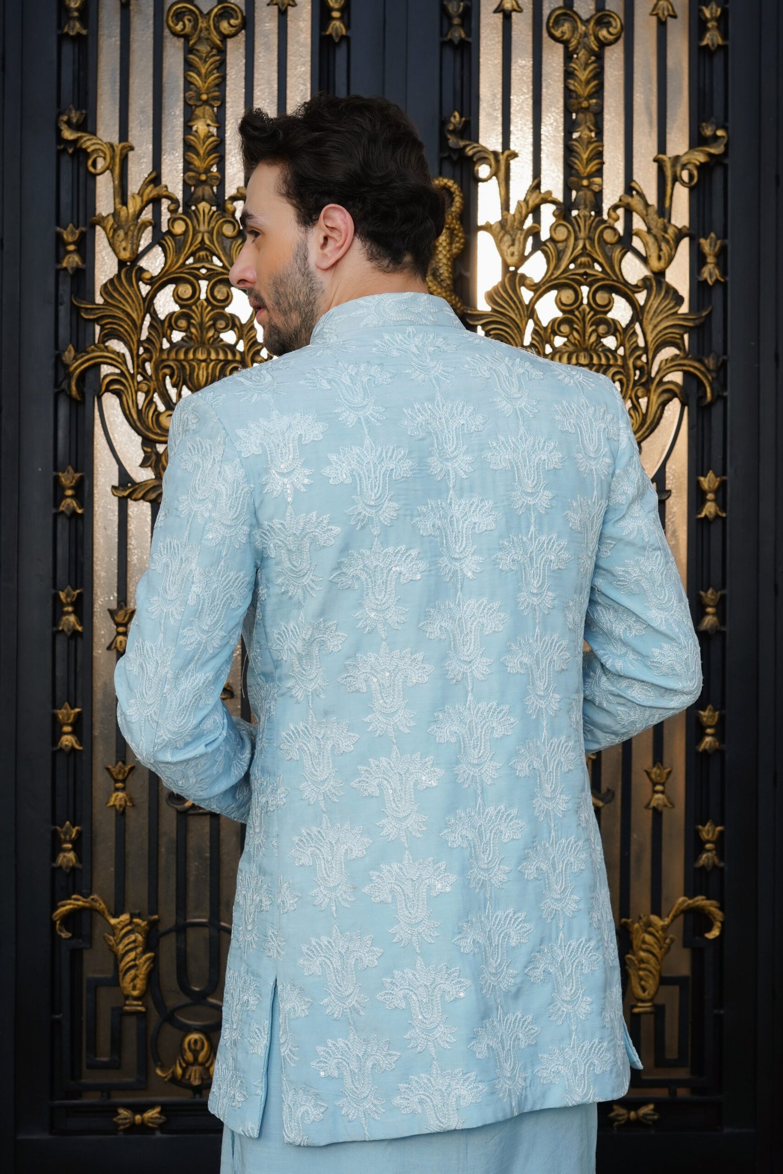 Experience unmatched style in our designer Sky Blue Embroidered Sherwani Jacket. This masterpiece features all-over floral motifs and a sophisticated long-line cut that adds height and authority to your frame. Crafted for those who appreciate the finer details, the jacket is complemented by a matching inner kurta with meticulous button detailing, making it a versatile choice for luxury wedding festivities and formal evening events.