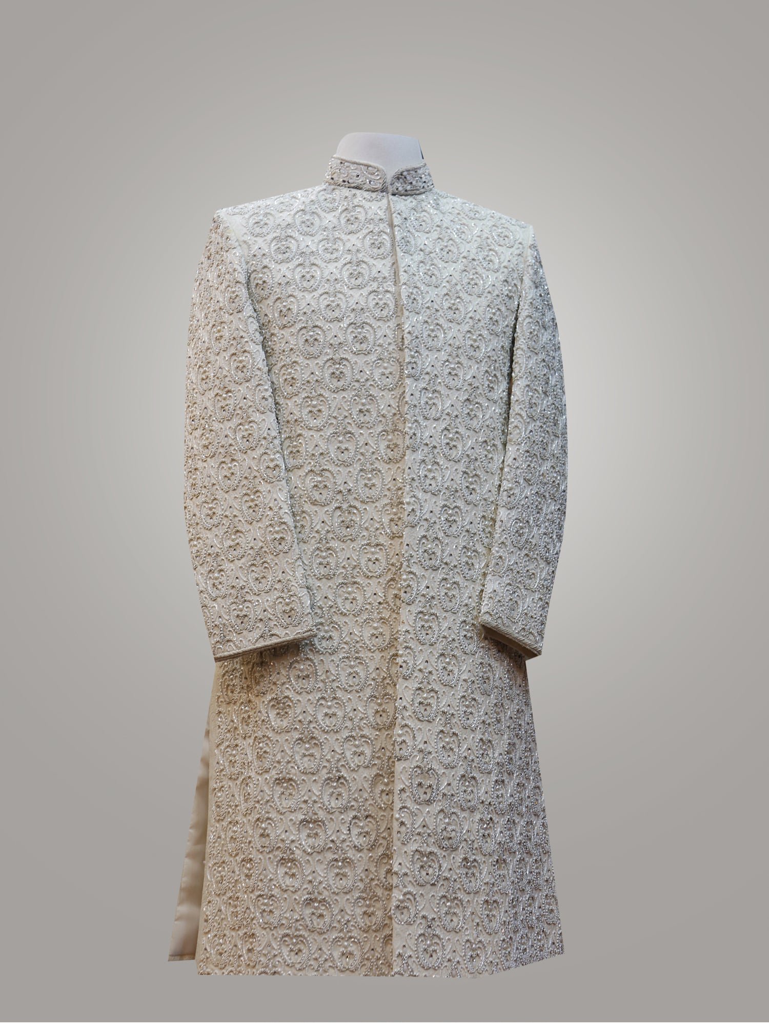 White sherwani in Jamawar fabric with adda work. Features intricate cutt dana work on front and arms. Regular fit, suitable for bride/groom wear.