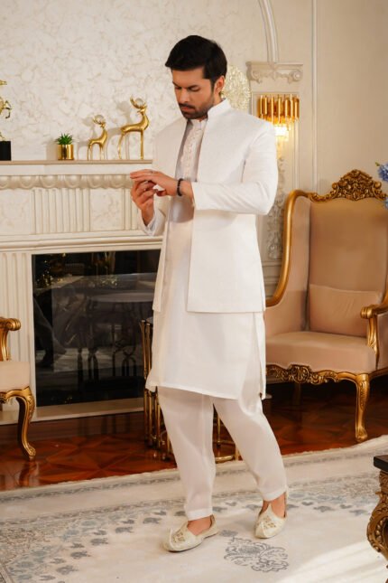 Off-White Shalwar Kameez (Ban Collar) by Azlan Shahzad